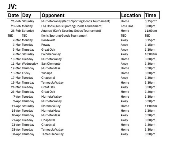 2026 JV Baseball Schedule