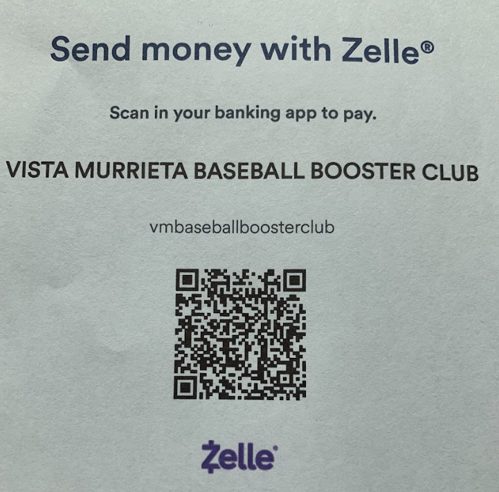 100% of all donations supports the Vista Murrieta Baseball Program. To make a donation scan the QR Code or use the phone number below to send a Zelle.